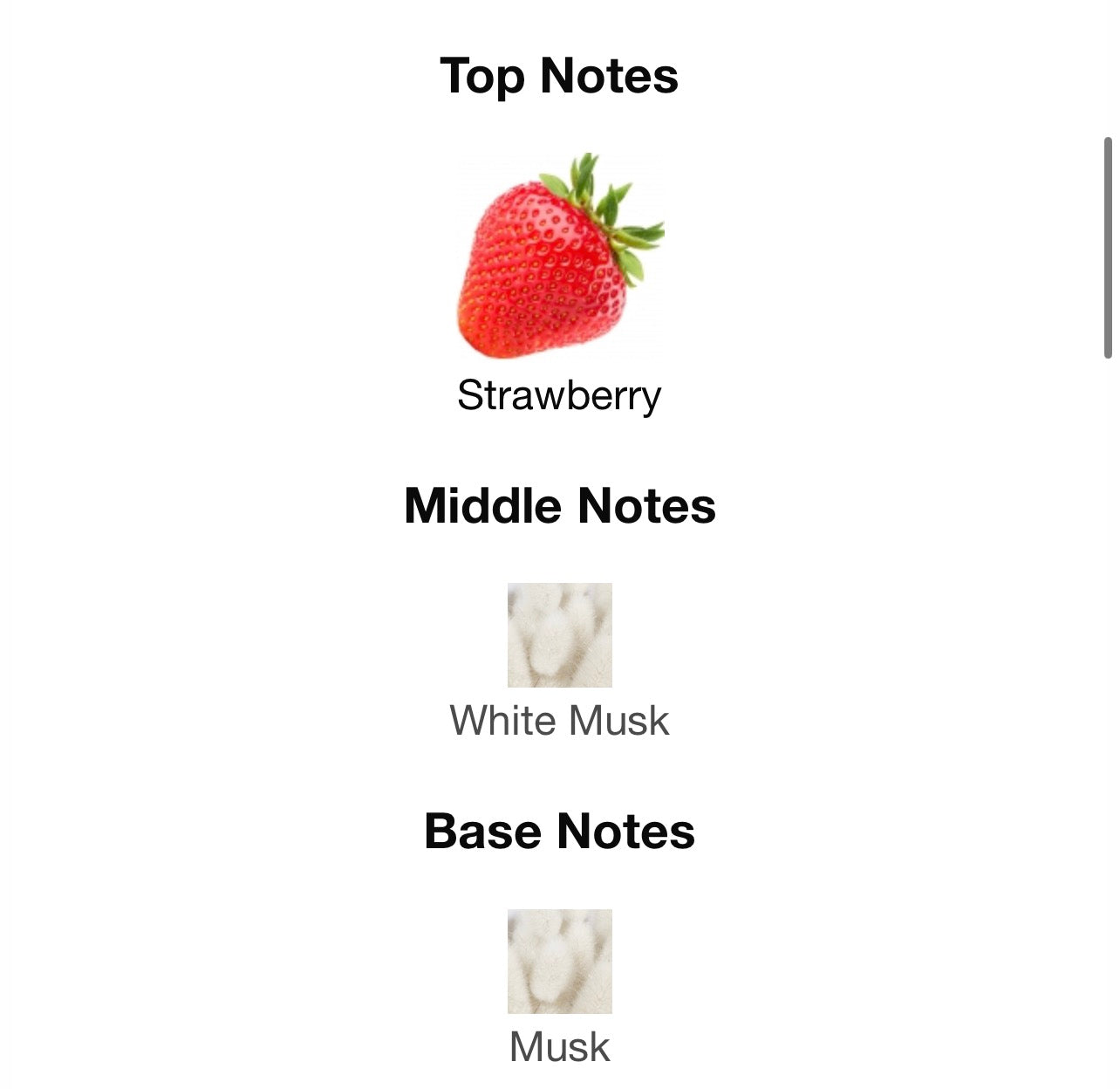 يفتتح زيت العطر بنفحات منعشة وعصيرية من الحمضيات والتوت الناضج، ليمنحكِ تجربة أولى مفعمة بالحيوية والنشاط. في قلب العطر، تتطور نفحات حلوة وفاكهية مع لمحات من التفاح والكمثرى ونفحات زهرية ناعمة، لتخلق مزيجًا عطريًا متوازنًا ولطيفًا. أما القاعدة فتكتمل بنفحات المسك الأبيض والفانيليا.