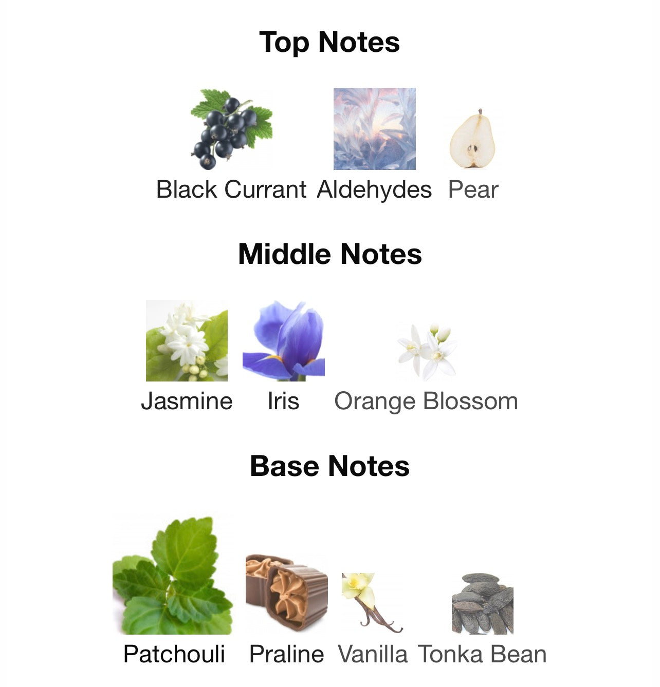- Toppnoter: Päron, svarta vinbär, aldehyder.